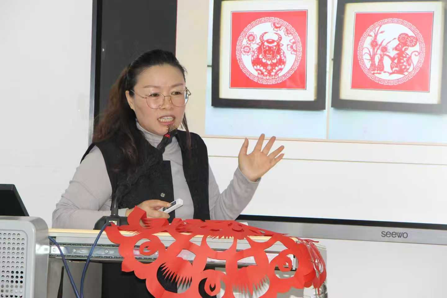 结合自身多年的传承与教学经验,李旺老师重点分享了唐山地域剪纸的特色:“咱们唐山剪纸既有北方剪纸的粗犷大气,又带着冀东民俗的细腻灵动——比如‘喜花’里的‘鱼戏莲’纹样,既藏着‘年年有余’的吉祥寓意,也体现了本地的农耕文化底色。”现场展示了多幅唐山传统剪纸作品,从婚俗剪纸的“龙凤呈祥”到节庆剪纸的“福字团花”,每一件作品的纹样、配色都对应着独特的文化语境,让师生们读懂了“剪纸是纸上的民俗诗”